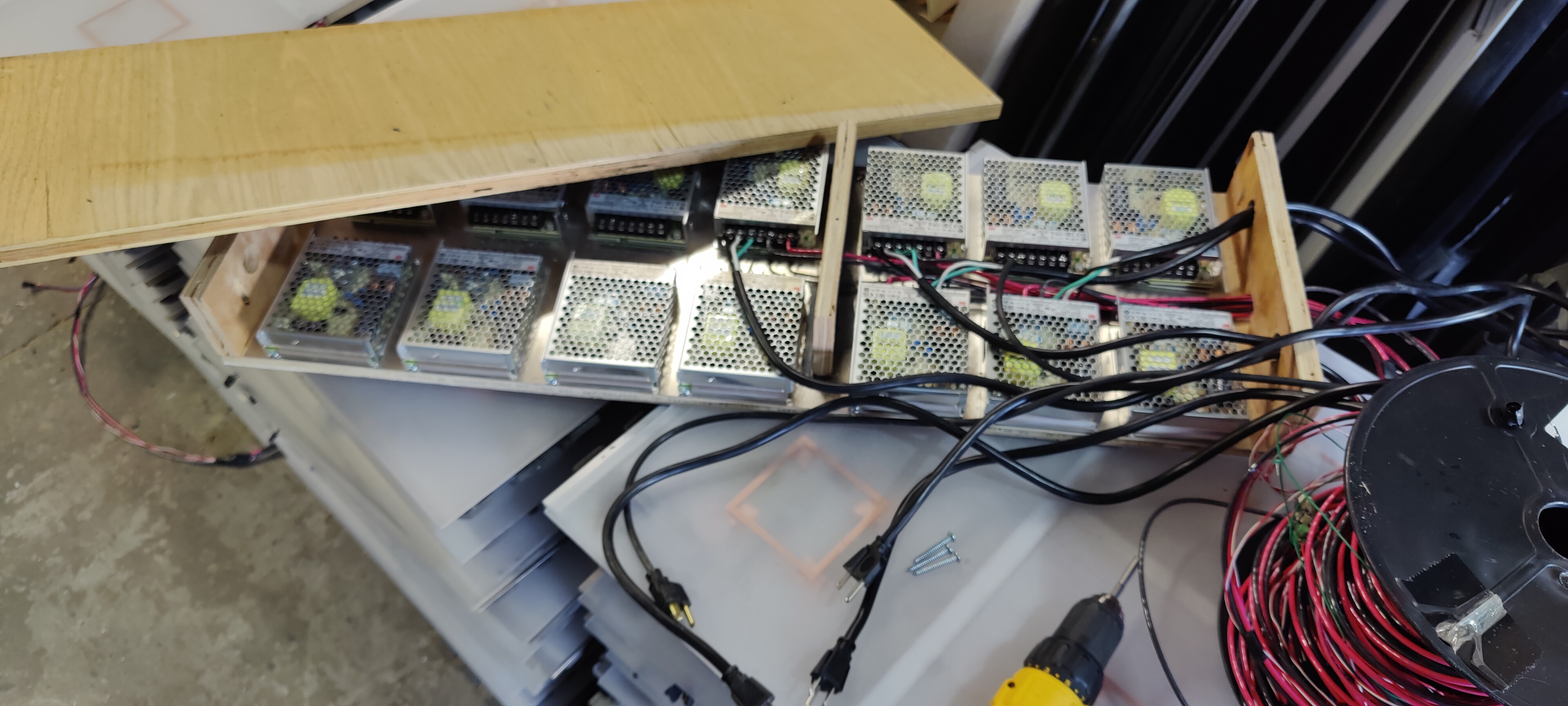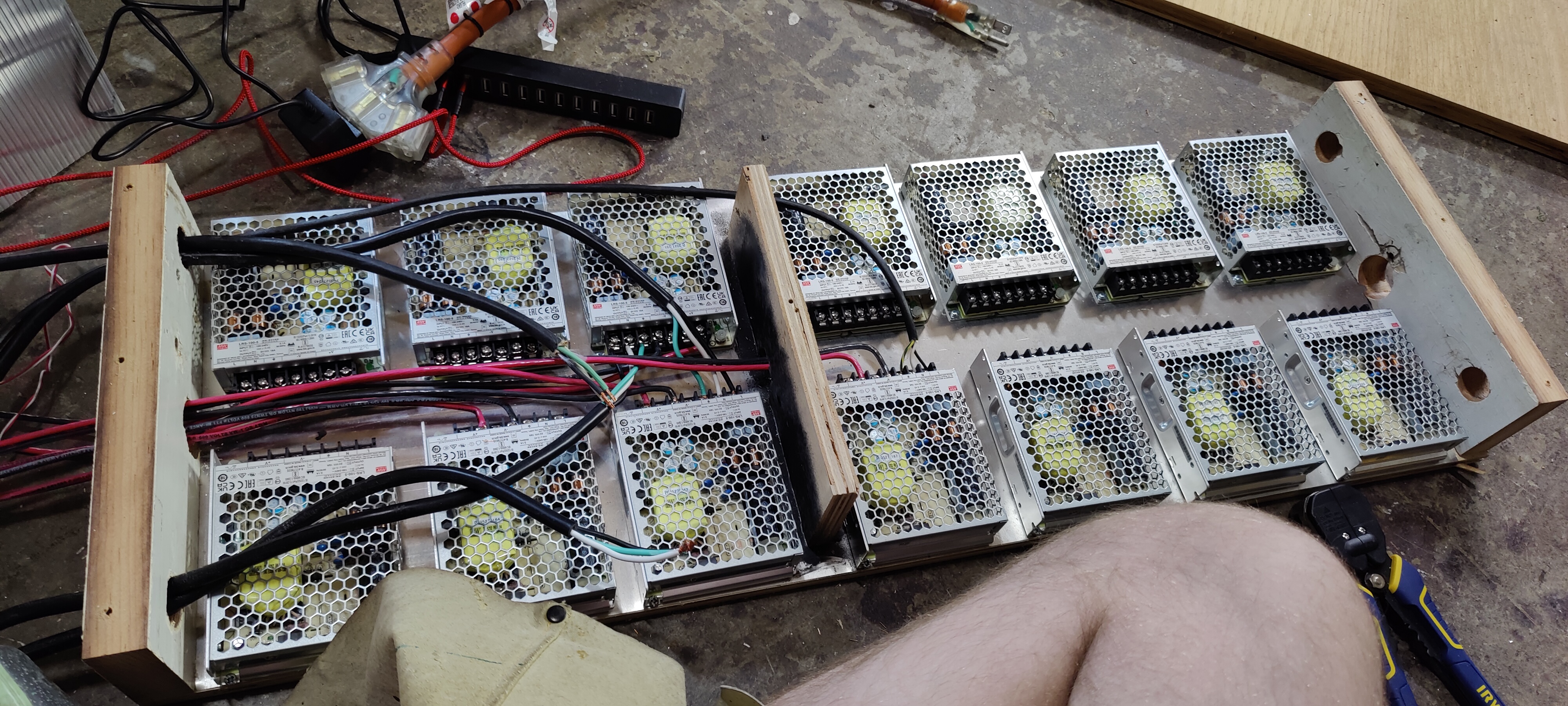 We screw 12 power supplies (plus 2 spares because why not?) together into a big case to keep it all safe.